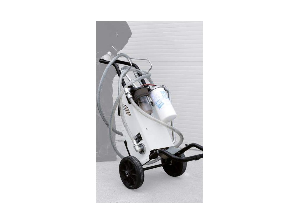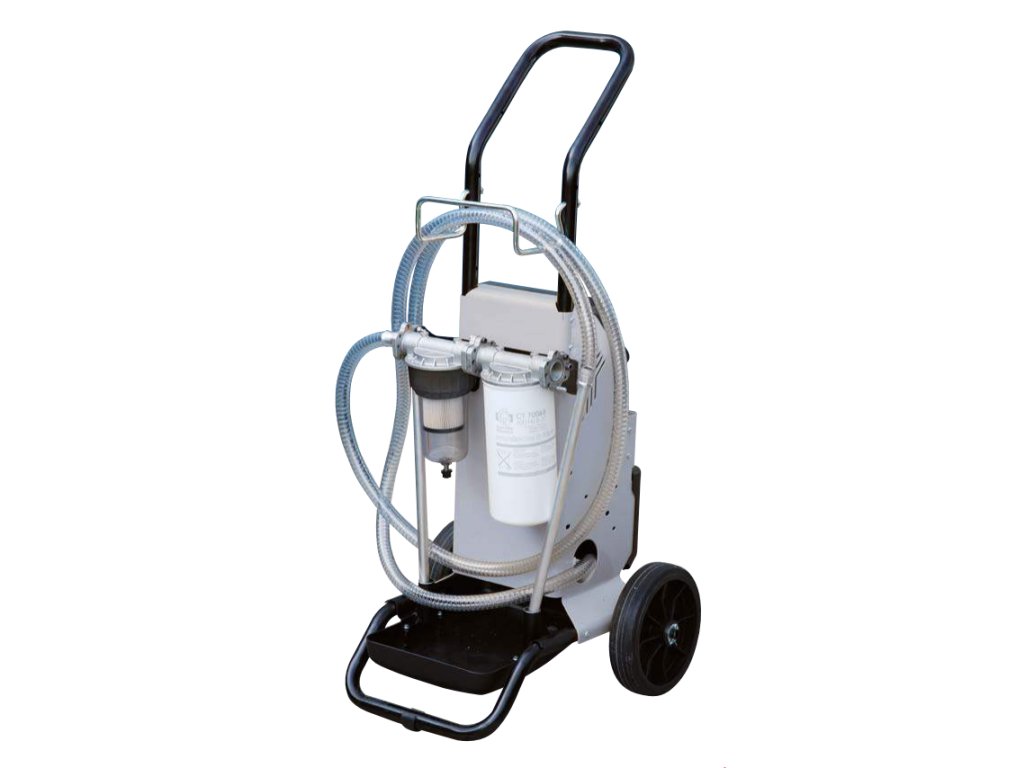 Robustní konstrukce na kolečkách, kola s velkým průměrem, průtok 56 l/min, filtrační kapacita - první stupeň 30 µ s absorpcí vody, druhý stupeň 5 µ na nečistoty.