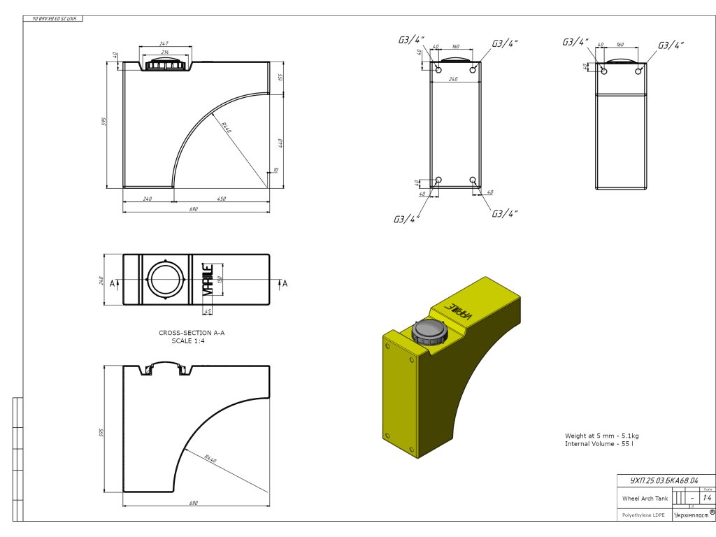 Rozměry 69×24×60 cm s úzkou šířkou pouhých 24 cm umožňují instalaci tam, kde se standardní nádrže nevejdou. Nádrž je vyrobena metodou rotomoldingu z jednoho kusu vysoce kvalitního polyethylenu, což eliminuje švy a zaručuje absolutní těsnost. Tloušťka stěny 4,5 mm je speciálně přizpůsobena náročným podmínkám mobilních aplikací.