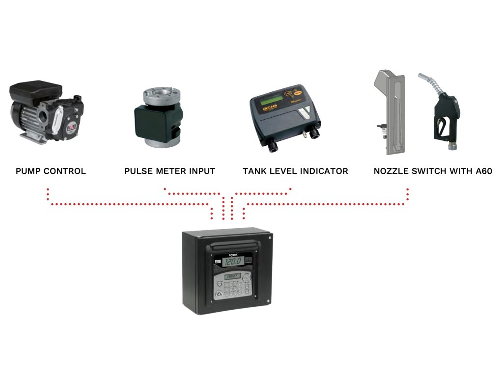 MCBOX umožňuje zapínanie čerpadla, identifikáciu autorizovaných užívateľov, predvoľbu vydávaného množstva a správu pulzného prietokomera. Podporuje tiež pripojenie externého spínača na vypnutie čerpadla pri minimálnej hladine a mikrospínača v držiaku výdajnej pištole. Vďaka tomu je možné ľahko rozšíriť alebo modernizovať existujúce výdajné systémy bez nutnosti výmeny čerpadla.
